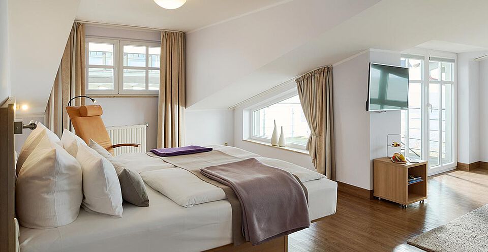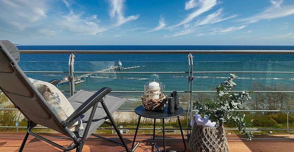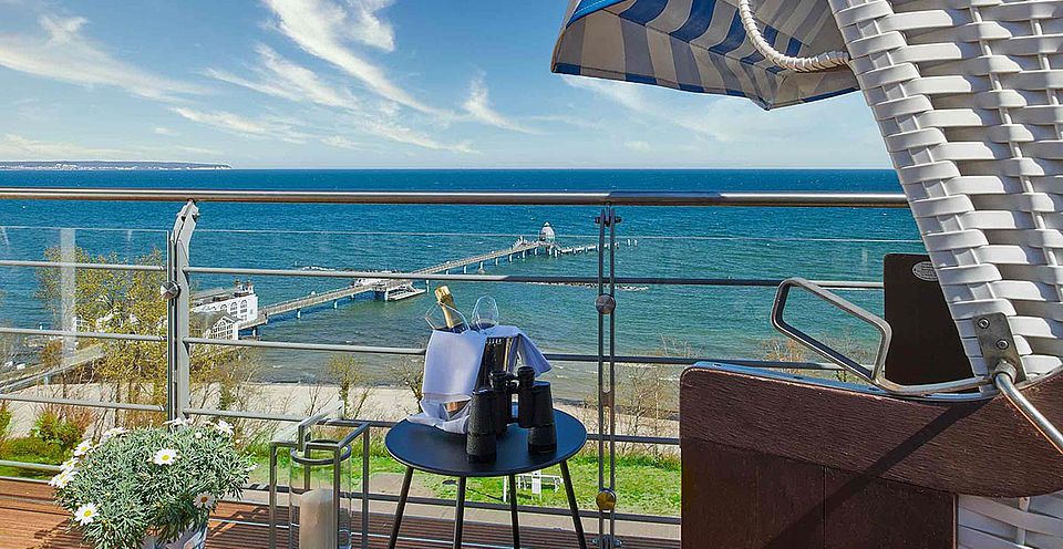 Die Panorama Junior Suiten bieten Ihnen einen einzigartigen, endlos weiten Blick über das Meer. Hervorzuheben ist der 11qm große Balkon, auf dem Sie von Mai bis Oktober im Strandkorb die gesunde Luft und den fantastischen Ostseeblick genießen können. Die Junior Suiten können für 1-2 Personen gebucht werden.